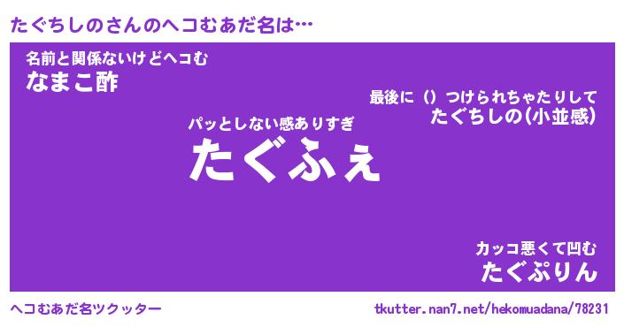 | 恥ずかしいあだ名 | 『プリティーたぐちしの』『たぐっちょ』 |