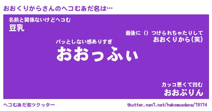 | 男性向けラノベタイトル風あだ名 | 『おおくりからの憂鬱』 |