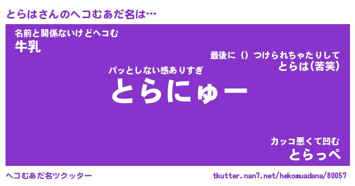 | ヒーロー風カッコイイあだ名 | 『スーパートラハ』『ウルトラとらはマン』 |