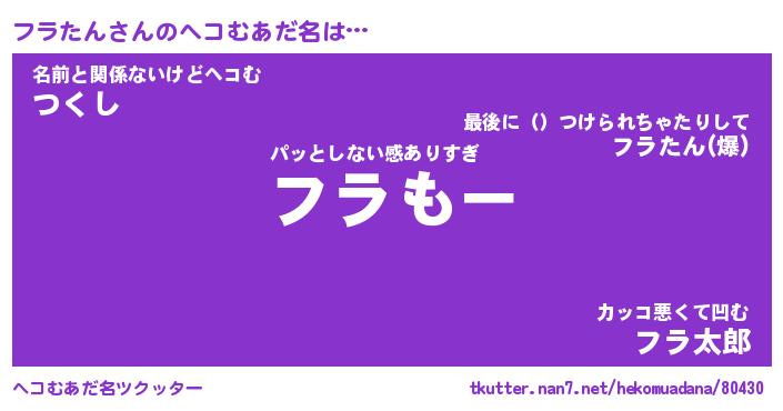 | 意味不明あだ名 | 『ペロリンフラたん』『永久保存フラたん』 |