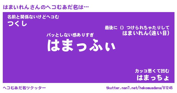 | 自動車の名前っぽいあだ名 | 『ハマティマ』『ハクア』『ハント』 |