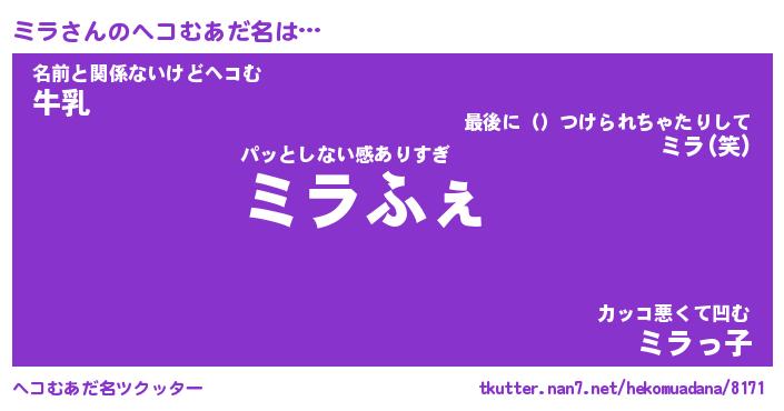 | 男性向けラノベタイトル風あだ名 | 『ミラの憂鬱』『ノーゲーム・ノーミラ』 |