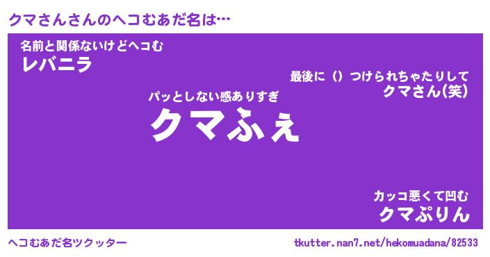 | 2回繰り返すあだ名 | 『クマクマ』『ククママ』『ぬらぬら』 |