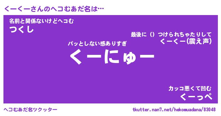 | 意味不明あだ名 | 『ペロリンくーくー』『永久保存くーくー』 |
