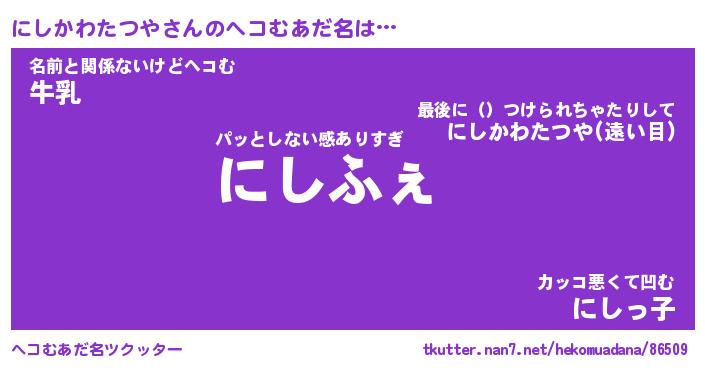 | 男性向けラノベタイトル風あだ名 | 『にしかわたつやの憂鬱』 |