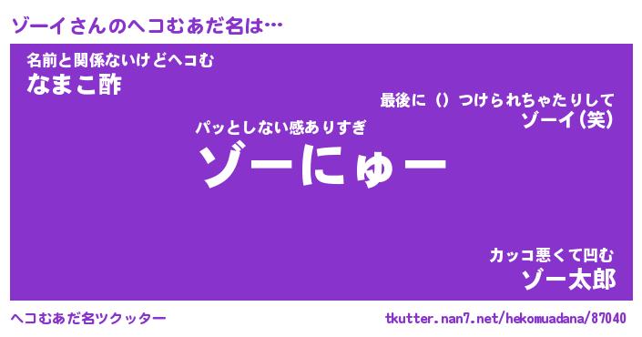 | ポケモン風あだ名 | 『ゾーチュウ』『ゾーイダネ』 |