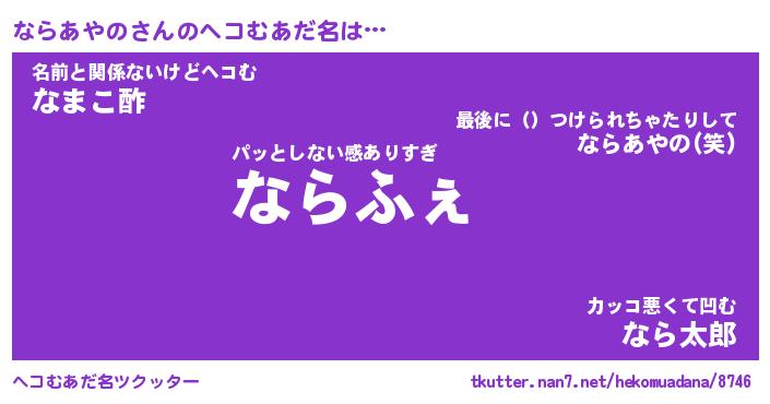 | ヒーロー風カッコイイあだ名 | 『スーパーナラアヤノ』『魔戒騎士ナラ』 |