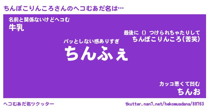 | 男性向けラノベタイトル風あだ名 | 『ちんぽこりんころの憂鬱』 |