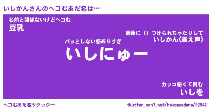 | 意味不明あだ名 | 『ペロリンいしかん』『永久保存いしかん』 |