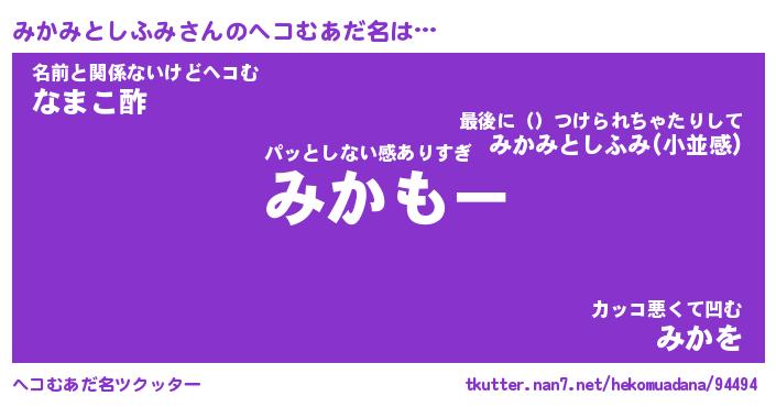 | 男性向けラノベタイトル風あだ名 | 『みかみとしふみの憂鬱』 |