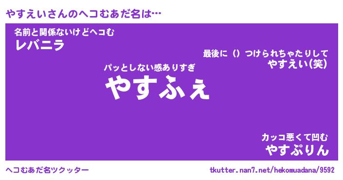 | 意味不明あだ名 | 『ペロリンやすえい』『永久保存やすえい』 |