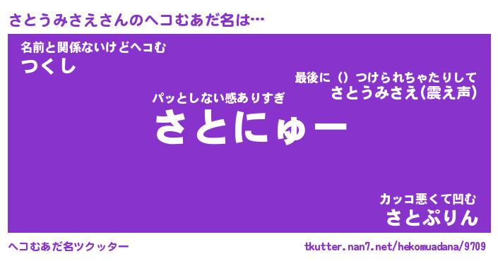 | ヒーロー風カッコイイあだ名 | 『スーパーサトウミサエ』『天弓騎士サト』 |