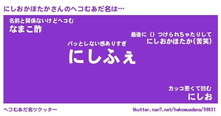 | 恥ずかしいあだ名 | 『プリティーにしおかほたか』『にしちん』 |