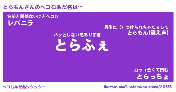 | 意味不明あだ名 | 『ペロリンとらもん』『永久保存とらもん』 |