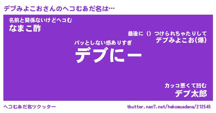 | 男性向けラノベタイトル風あだ名 | 『デブみよこおの憂鬱』 |