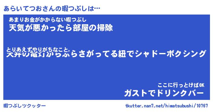 あらいてつおさんの暇つぶしは… とりあえずやりがちなこと『天井の電灯からぶらさがってる紐でシャドーボクシング』あまりお金がかからない暇つぶし『天気が悪かったら部屋の掃除』ここに行っとけばOK『ガストでドリンクバー』 ツクッター #暇つぶしツクッター http://tkutter.nan7.net/himatsubushi/10767/