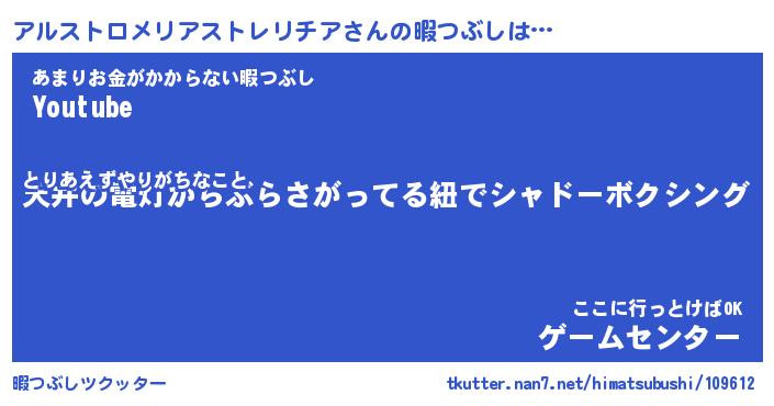 | ツイッター | アルストロメリアストレリチアさんのツイッターID『dendenmushi_man』 |