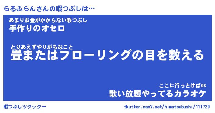 | ヘコむあだ名 | 『らるもー』『つくし』『らる太郎』 |