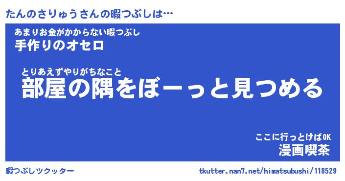 たんのさりゅうさんの暇つぶしは… とりあえずやりがちなこと『部屋の隅をぼーっと見つめる』あまりお金がかからない暇つぶし『手作りのオセロ』ここに行っとけばOK『漫画喫茶』 ツクッター #暇つぶしツクッター http://tkutter.nan7.net/himatsubushi/118529/