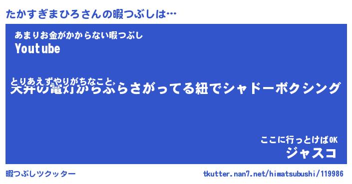 たかすぎまひろさんの暇つぶしは… とりあえずやりがちなこと『天井の電灯からぶらさがってる紐でシャドーボクシング』あまりお金がかからない暇つぶし『Youtube』ここに行っとけばOK『ジャスコ』 ツクッター #暇つぶしツクッター http://tkutter.nan7.net/himatsubushi/119986/