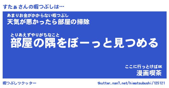 すたぁさんの暇つぶしは… とりあえずやりがちなこと『部屋の隅をぼーっと見つめる』あまりお金がかからない暇つぶし『天気が悪かったら部屋の掃除』ここに行っとけばOK『漫画喫茶』 ツクッター #暇つぶしツクッター http://tkutter.nan7.net/himatsubushi/125121/