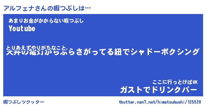 | 肩書あだ名 | 『アルフェナ社長』『アルフェナ総理大臣』 |