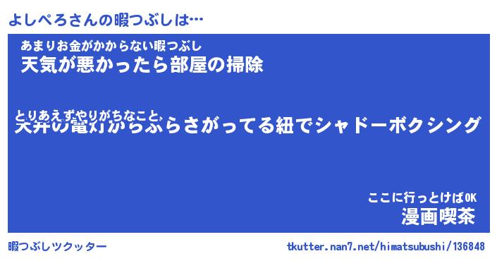 よしぺろさんの暇つぶしは… とりあえずやりがちなこと『天井の電灯からぶらさがってる紐でシャドーボクシング』あまりお金がかからない暇つぶし『天気が悪かったら部屋の掃除』ここに行っとけばOK『漫画喫茶』 ツクッター #暇つぶしツクッター http://tkutter.nan7.net/himatsubushi/136848/