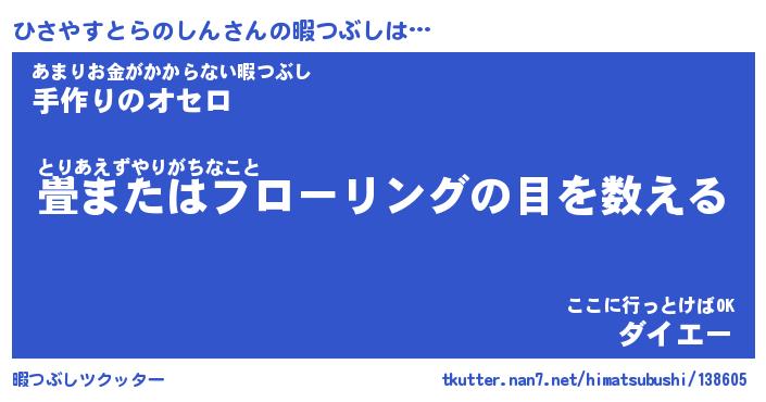 ひさやすとらのしんさんの暇つぶしは… とりあえずやりがちなこと『畳またはフローリングの目を数える』あまりお金がかからない暇つぶし『手作りのオセロ』ここに行っとけばOK『ダイエー』 ツクッター #暇つぶしツクッター http://tkutter.nan7.net/himatsubushi/138605/