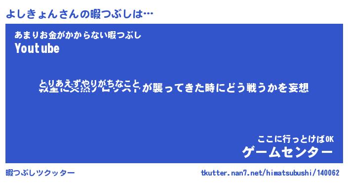 よしきょんさんの暇つぶしは… とりあえずやりがちなこと『教室に突然テロリストが襲ってきた時にどう戦うかを妄想』あまりお金がかからない暇つぶし『Youtube』ここに行っとけばOK『ゲームセンター』 ツクッター #暇つぶしツクッター http://tkutter.nan7.net/himatsubushi/140062/