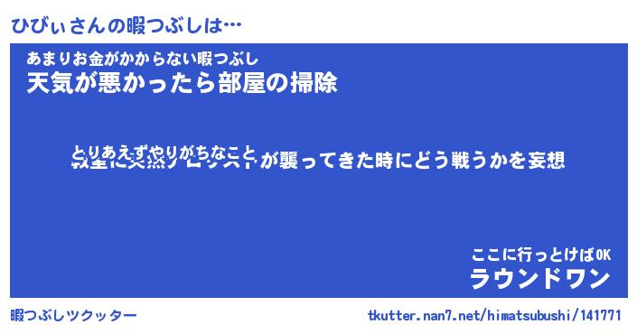 ひびぃさんの暇つぶしは… とりあえずやりがちなこと『教室に突然テロリストが襲ってきた時にどう戦うかを妄想』あまりお金がかからない暇つぶし『天気が悪かったら部屋の掃除』ここに行っとけばOK『ラウンドワン』 ツクッター #暇つぶしツクッター http://tkutter.nan7.net/himatsubushi/141771/