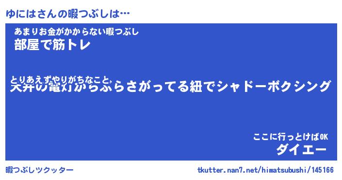 ゆにはさんの暇つぶしは… とりあえずやりがちなこと『天井の電灯からぶらさがってる紐でシャドーボクシング』あまりお金がかからない暇つぶし『部屋で筋トレ』ここに行っとけばOK『ダイエー』 ツクッター #暇つぶしツクッター http://tkutter.nan7.net/himatsubushi/145166/
