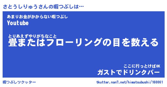 さとうしりゅうさんの暇つぶしは… とりあえずやりがちなこと『畳またはフローリングの目を数える』あまりお金がかからない暇つぶし『Youtube』ここに行っとけばOK『ガストでドリンクバー』 ツクッター #暇つぶしツクッター http://tkutter.nan7.net/himatsubushi/160061/