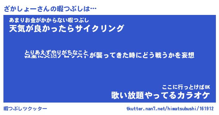 ざかしょーさんの暇つぶしは… とりあえずやりがちなこと『教室に突然テロリストが襲ってきた時にどう戦うかを妄想』あまりお金がかからない暇つぶし『天気が良かったらサイクリング』ここに行っとけばOK『歌い放題やってるカラオケ』 ツクッター #暇つぶしツクッター http://tkutter.nan7.net/himatsubushi/161912/
