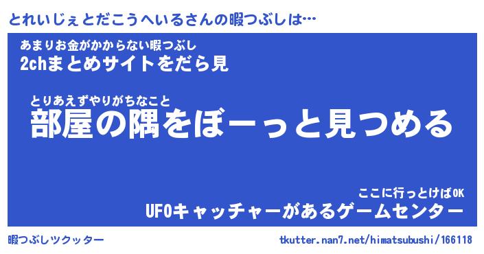 とれいじぇとだこうへいるさんの暇つぶしは… とりあえずやりがちなこと『部屋の隅をぼーっと見つめる』あまりお金がかからない暇つぶし『2chまとめサイトをだら見』ここに行っとけばOK『UFOキャッチャーがあるゲームセンター』 ツクッター #暇つぶしツクッター http://tkutter.nan7.net/himatsubushi/166118/