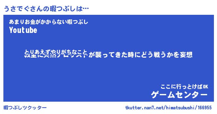 うさでぐさんの暇つぶしは… とりあえずやりがちなこと『教室に突然テロリストが襲ってきた時にどう戦うかを妄想』あまりお金がかからない暇つぶし『Youtube』ここに行っとけばOK『ゲームセンター』 ツクッター #暇つぶしツクッター http://tkutter.nan7.net/himatsubushi/166955/