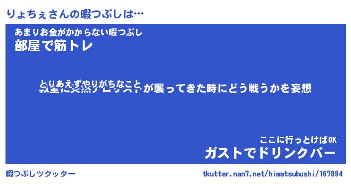 りょちぇさんの暇つぶしは… とりあえずやりがちなこと『教室に突然テロリストが襲ってきた時にどう戦うかを妄想』あまりお金がかからない暇つぶし『部屋で筋トレ』ここに行っとけばOK『ガストでドリンクバー』 ツクッター #暇つぶしツクッター http://tkutter.nan7.net/himatsubushi/167894/