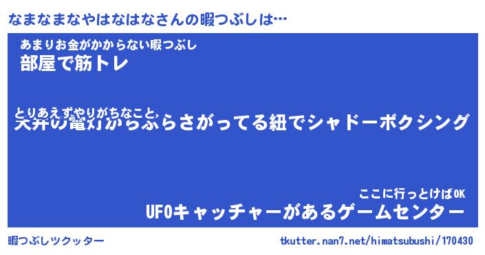 なまなまなやはなはなさんの暇つぶしは… とりあえずやりがちなこと『天井の電灯からぶらさがってる紐でシャドーボクシング』あまりお金がかからない暇つぶし『部屋で筋トレ』ここに行っとけばOK『UFOキャッチャーがあるゲームセンター』 ツクッター #暇つぶしツクッター http://tkutter.nan7.net/himatsubushi/170430/