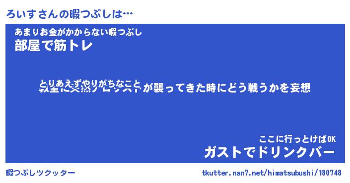 ろいすさんの暇つぶしは… とりあえずやりがちなこと『教室に突然テロリストが襲ってきた時にどう戦うかを妄想』あまりお金がかからない暇つぶし『部屋で筋トレ』ここに行っとけばOK『ガストでドリンクバー』 ツクッター #暇つぶしツクッター http://tkutter.nan7.net/himatsubushi/180748/