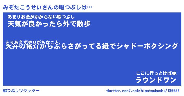 みぞたこうせいさんの暇つぶしは… とりあえずやりがちなこと『天井の電灯からぶらさがってる紐でシャドーボクシング』あまりお金がかからない暇つぶし『天気が良かったら外で散歩』ここに行っとけばOK『ラウンドワン』 ツクッター #暇つぶしツクッター http://tkutter.nan7.net/himatsubushi/186656/
