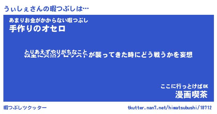 うぃしぇさんの暇つぶしは… とりあえずやりがちなこと『教室に突然テロリストが襲ってきた時にどう戦うかを妄想』あまりお金がかからない暇つぶし『手作りのオセロ』ここに行っとけばOK『漫画喫茶』 ツクッター #暇つぶしツクッター http://tkutter.nan7.net/himatsubushi/18712/