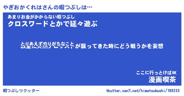 | 伝説のあだ名 | 『封印されしスナイパーやぎおかくれは』 |
