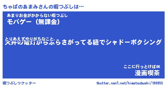 ちゃばのあまみさんの暇つぶしは… とりあえずやりがちなこと『天井の電灯からぶらさがってる紐でシャドーボクシング』あまりお金がかからない暇つぶし『モバゲー(無課金)』ここに行っとけばOK『漫画喫茶』 ツクッター #暇つぶしツクッター http://tkutter.nan7.net/himatsubushi/190855/