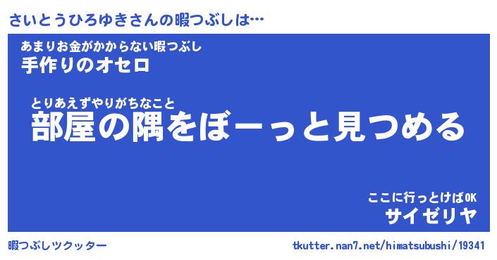 さいとうひろゆきさんの暇つぶしは… とりあえずやりがちなこと『部屋の隅をぼーっと見つめる』あまりお金がかからない暇つぶし『手作りのオセロ』ここに行っとけばOK『サイゼリヤ』 ツクッター #暇つぶしツクッター http://tkutter.nan7.net/himatsubushi/19341/