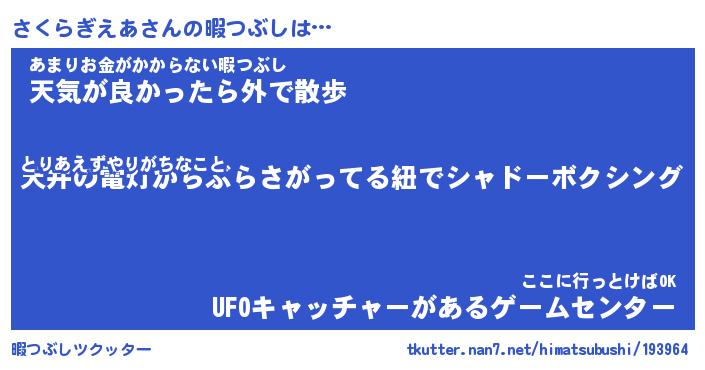 さくらぎえあさんの暇つぶしは… とりあえずやりがちなこと『天井の電灯からぶらさがってる紐でシャドーボクシング』あまりお金がかからない暇つぶし『天気が良かったら外で散歩』ここに行っとけばOK『UFOキャッチャーがあるゲームセンター』 ツクッター #暇つぶしツクッター http://tkutter.nan7.net/himatsubushi/193964/