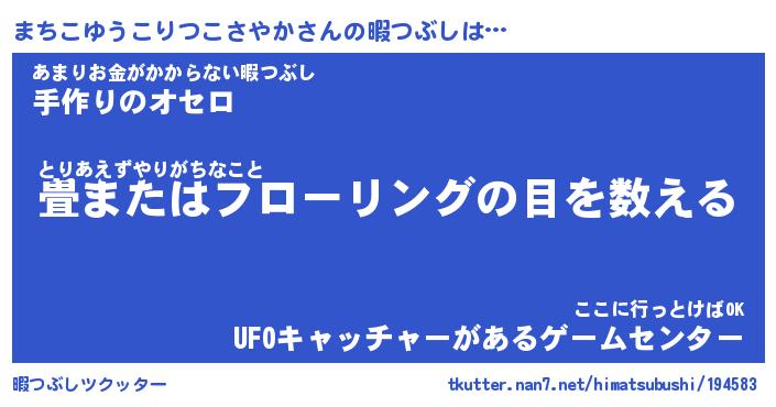 まちこゆうこりつこさやかさんの暇つぶしは… とりあえずやりがちなこと『畳またはフローリングの目を数える』あまりお金がかからない暇つぶし『手作りのオセロ』ここに行っとけばOK『UFOキャッチャーがあるゲームセンター』 ツクッター #暇つぶしツクッター http://tkutter.nan7.net/himatsubushi/194583/