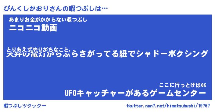 ぴんくしかおりさんの暇つぶしは… とりあえずやりがちなこと『天井の電灯からぶらさがってる紐でシャドーボクシング』あまりお金がかからない暇つぶし『ニコニコ動画』ここに行っとけばOK『UFOキャッチャーがあるゲームセンター』 ツクッター #暇つぶしツクッター http://tkutter.nan7.net/himatsubushi/19767/