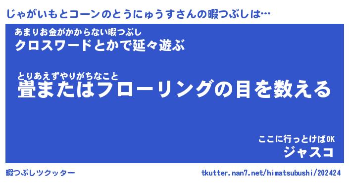 | ツイッター | じゃがいもとコーンのとうにゅうすさんのツイッターID『renkon_idle』 |