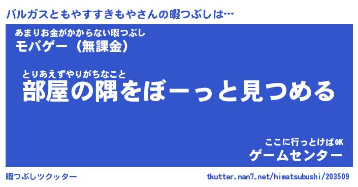 バルガスともやすすきもやさんの暇つぶしは… とりあえずやりがちなこと『部屋の隅をぼーっと見つめる』あまりお金がかからない暇つぶし『モバゲー(無課金)』ここに行っとけばOK『ゲームセンター』 ツクッター #暇つぶしツクッター http://tkutter.nan7.net/himatsubushi/203509/