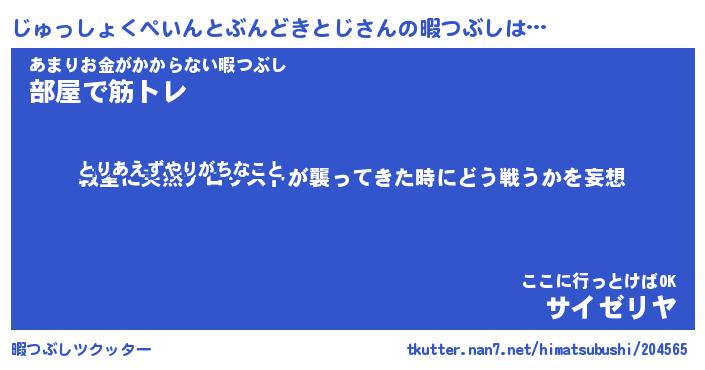 じゅっしょくぺいんとぶんどきとじさんの暇つぶしは… とりあえずやりがちなこと『教室に突然テロリストが襲ってきた時にどう戦うかを妄想』あまりお金がかからない暇つぶし『部屋で筋トレ』ここに行っとけばOK『サイゼリヤ』 ツクッター #暇つぶしツクッター http://tkutter.nan7.net/himatsubushi/204565/