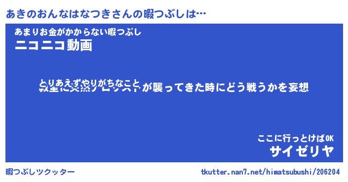 あきのおんなはなつきさんの暇つぶしは… とりあえずやりがちなこと『教室に突然テロリストが襲ってきた時にどう戦うかを妄想』あまりお金がかからない暇つぶし『ニコニコ動画』ここに行っとけばOK『サイゼリヤ』 ツクッター #暇つぶしツクッター http://tkutter.nan7.net/himatsubushi/206204/